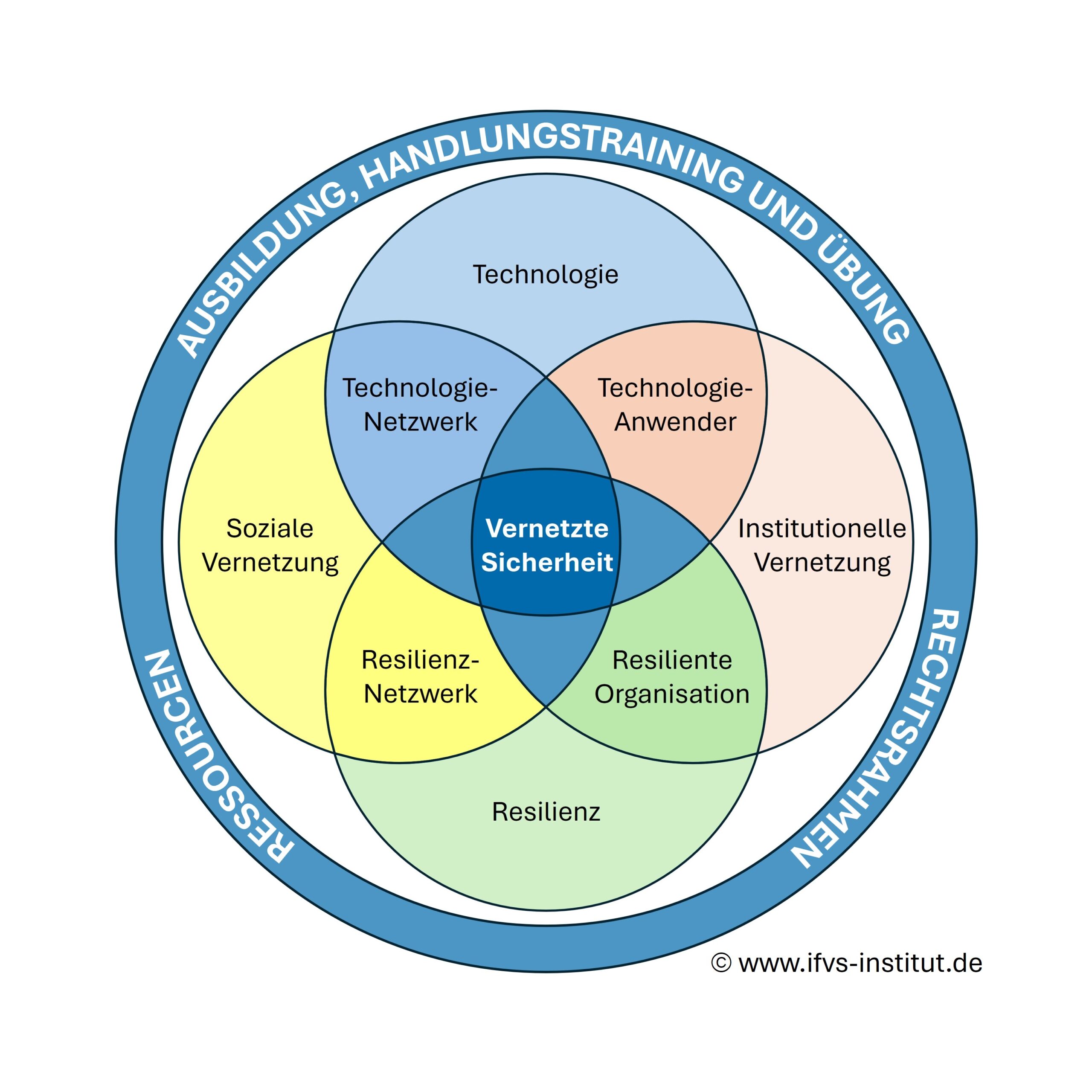 Vernetzte Sicherheit kann demzufolge nur aus der Schnittmenge von institutioneller und sozialer Vernetzung, Technologie und Resilienz entstehen. Rechtssicherheit, eine ausreichende Ausstattung mit Ressourcen sowie die Verfügbarkeit eines modernen Ausbildungs- und Trainingssystems sind hierfür unabdingbare Voraussetzungen.